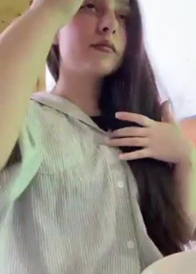A young woman with long, dark brown hair, wearing a striped button-down shirt, sits in what appears to be an outdoor eating area with wooden walls and ceiling. She looks directly at the camera, adjusts her hair, and seems to be waiting or pausing for something. The lighting fluctuates in the video, going from a natural light to one with a green tint. There are indistinct objects and sounds in the background, suggesting other people are present.