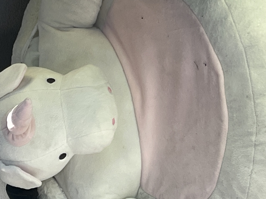 - "The image displays a close-up of a large, white plush unicorn head, which appears to be part of a plush chair or soft furniture item" by FM-GXbXh1, licensed under CC BY 4.0