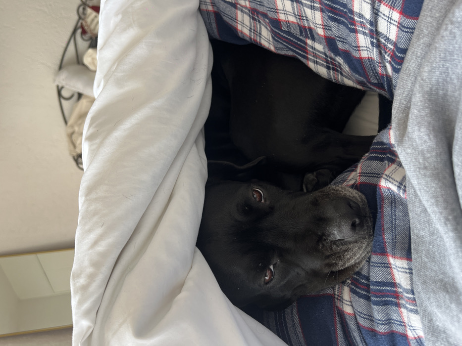 - "A black-furred dog with dark eyes and a grey muzzle lies partially concealed under a white duvet" by FM-rt1oC3, licensed under CC BY 4.0