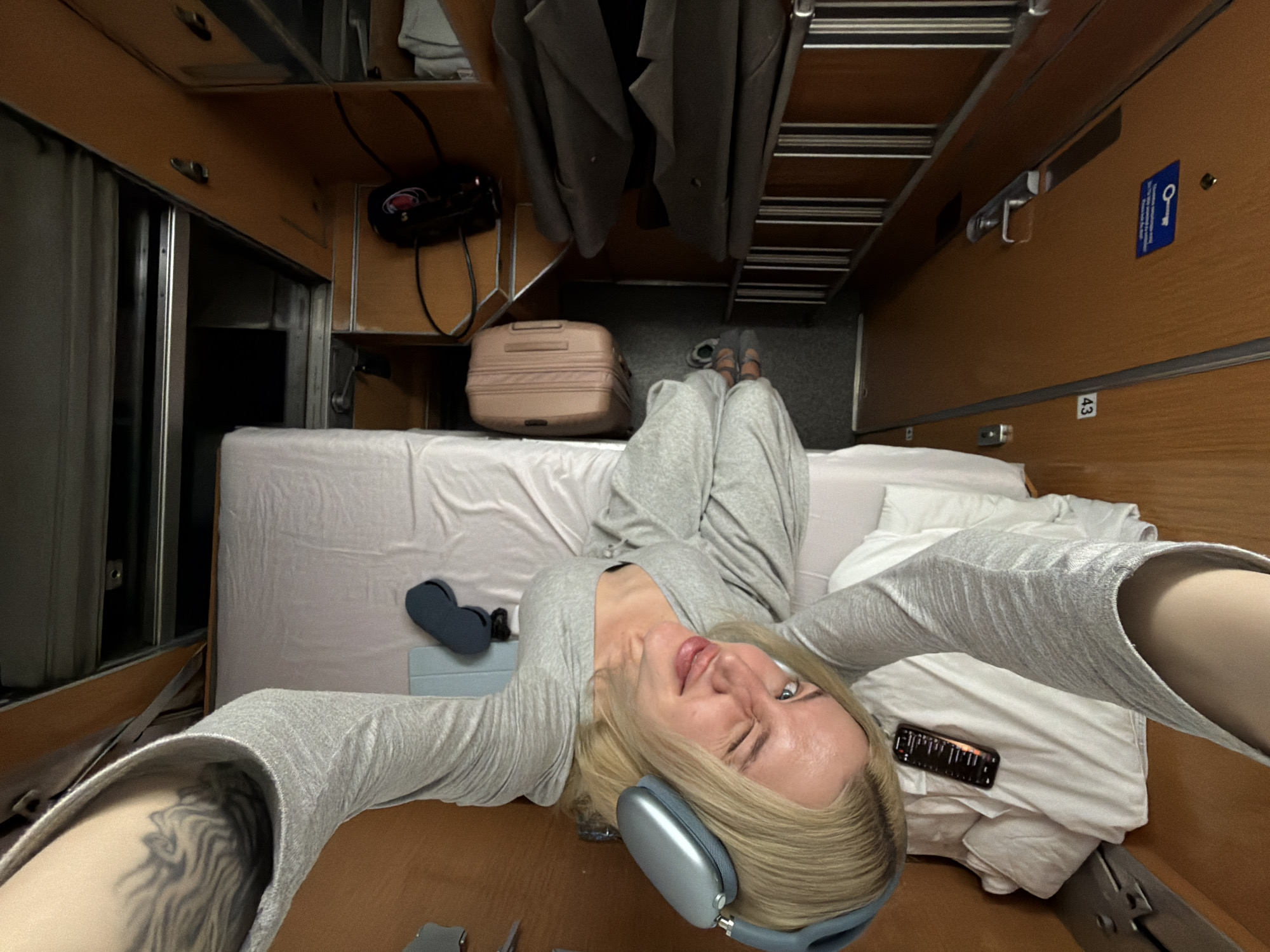 The scene depicts the interior of a compact private sleeping cabin, stated to be located in Virpazar, Montenegro. The image is a high-angle selfie. A blonde individual, appearing to be female, is positioned diagonally across the frame, looking towards the camera with a slight smile and a winking left eye. She wears light grey long-sleeved loungewear and light blue over-ear headphones. A dark, abstract tattoo is visible on her upper left arm. Her legs, wearing sandals, are seen extending towards the bottom right. She rests partially on a single bed with white linen, where a mobile phone displaying a list interface is placed on a pillow. Adjacent to the bed, a light blue tablet cover and a dark blue sleep mask are on a wooden shelf. The cabin's interior features light brown wooden paneling throughout. A small, light pink hard-shell suitcase stands on the carpeted floor next to the bed. Above the suitcase, a black electronic device with a red indicator and cables is mounted on the wall. A stack of folded grey items is visible in an open storage compartment to the right of the suitcase. A metallic ladder, likely for accessing an upper bunk, is positioned along the right wall. The bottom right features a wooden door with a silver handle, marked with the number "43" and a blue sticker displaying a white key icon and text. A dark rectangular opening, possibly a window with a drawn blind, is visible above the head of the bed.