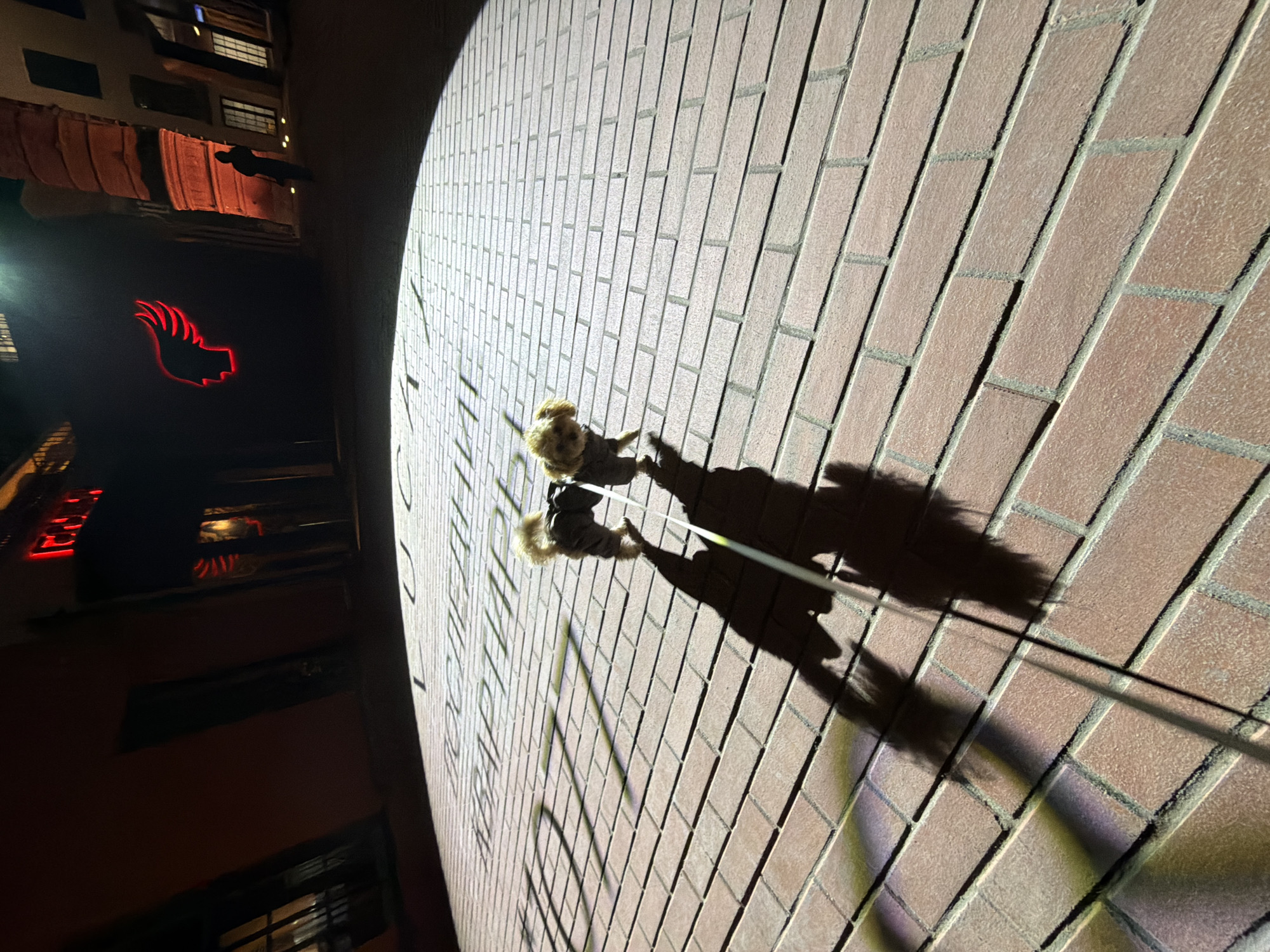 The image depicts a nocturnal street scene on a brick-paved pedestrian thoroughfare identified as Arbat Street 1, Moscow, Russia. Two small, light-furred dogs, possibly Yorkshire Terriers, are walking forward in the mid-ground. Both dogs wear dark-colored coats. A light-colored leash extends from one dog towards the bottom-left, indicating the presence of an unseen handler, whose elongated shadow is cast prominently on the pavement alongside the dogs' shadows. The ground is composed of reddish-brown rectangular paving bricks. In the background, dark building facades line the street. A bright red neon sign, shaped as a winged head profile, is mounted on a building to the left, identifiable as the logo for "Wings Cocktail Bar." Above it, another red neon sign displays Russian Cyrillic letters that appear to spell "РЕДЪ" (RED). To the right, a building displays a reddish, columnar architectural feature, and a silhouetted human figure is faintly visible standing or walking in the distant background. A strong, circular spotlight illuminates the foreground pavement, projecting Russian Cyrillic text, including "ПОСЛЕДНИЕ" and "КВАРТИРЫ" ("Last Apartments"). The overall environment is an urban setting illuminated by artificial light sources.