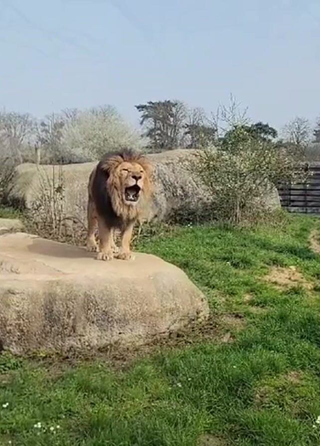 male lion standing on a large rock in what appears to be a zoo enclosure. The lion has a full mane and appears to be roaring or vocalizing. The enclosure has other large rocks, grass, some bare trees, and fencing in the background. A wooden post stands near the edge of the enclosure. The sky is light blue.
