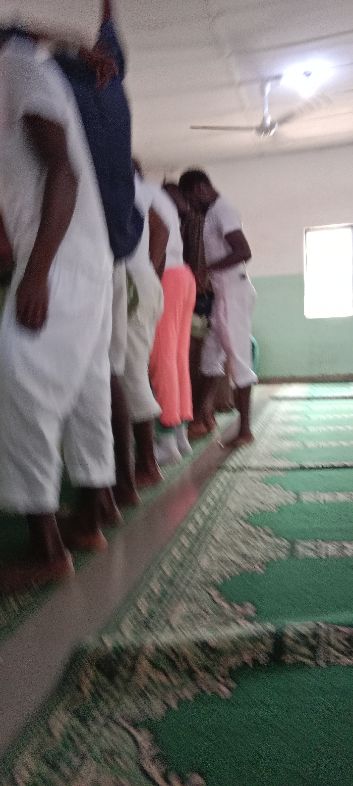 The scene depicts an indoor gathering of at least six individuals in the city of Iyara, Nigeria. The room features light-colored walls, with the lower section painted a light green and the upper section off-white. The floor is covered with green patterned carpets or prayer rugs. A bright rectangular window is visible on the right wall, providing natural light. A silver-colored ceiling fan and a luminous light fixture are present on the off-white ceiling. The individuals are positioned in a linear formation, primarily facing away from the camera, with their feet aligned along a subtle raised line or demarcation on the carpet. Most individuals are wearing loose-fitting white clothing. One person is dressed in dark blue attire, and another is wearing bright pink/coral trousers. Individuals appear to be barefoot or wearing very light footwear. No specific actions or interactions between the individuals are clearly discernible beyond their static alignment. The overall lighting is bright, suggesting adequate illumination from both natural and artificial sources.