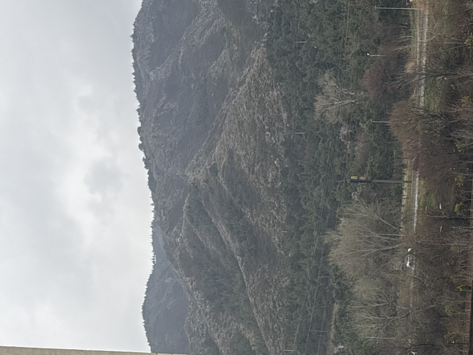 The image depicts a mountainous landscape under an overcast sky in Tbilisi, Georgia. The upper two-thirds of the scene consist of multiple prominent mountain ridges and slopes covered with a mixture of dark green coniferous trees and dormant, greyish-brown deciduous shrubs or sparse vegetation. Some lighter, possibly rocky or bare, patches are visible on the upper slopes. In the midground, a dense band of dark green evergreen trees forms a lower forest line. Horizontally traversing this section are multiple power lines supported by several vertical utility poles. Below these lines, a paved multi-lane road or highway is partially visible, running from left to right. A black traffic light pole with vertically aligned signal heads (red at the top, green at the bottom) stands on the right side of the road. A single light-colored vehicle is discernible on the road to the left of the traffic light. A tall, bare deciduous tree with light bark is also visible near the road, to the left of the traffic light. The foreground is characterized by a dense array of bare deciduous trees and shrubs, indicating a dormant season. Several dark-colored street light poles, each fitted with multiple luminaires, are visible on the right side of the foreground. A dark-colored, horizontal fence-like structure is present along the very bottom edge of the image, partially obscured by low-lying bushes. The overall lighting is diffuse and even, consistent with an overcast day. No individuals or specific actions are discernible.
