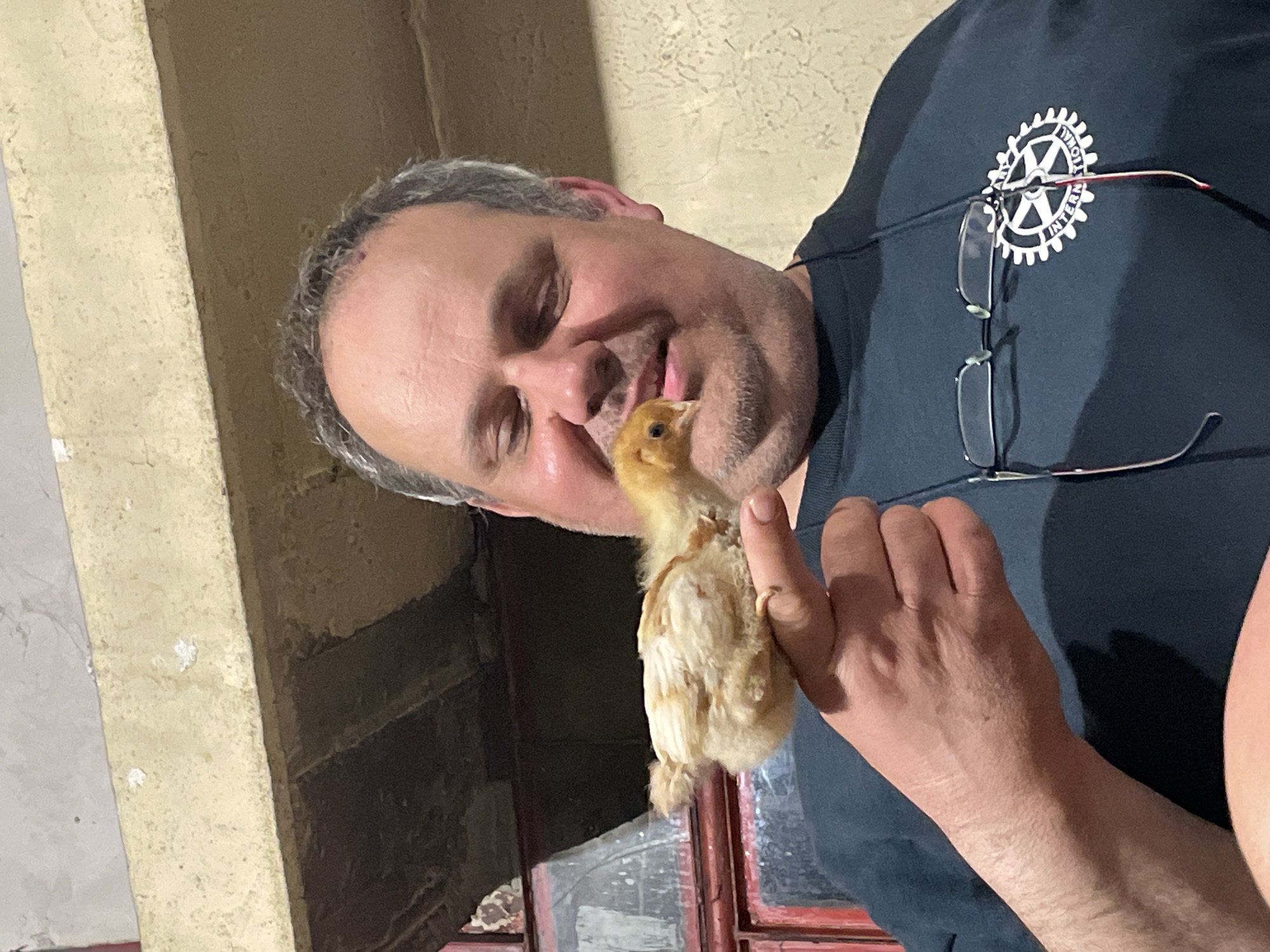 An indoor scene depicts a middle-aged man holding a small chick. The man has short, graying hair and is wearing a dark blue t-shirt with a Rotary International logo on the chest. A pair of eyeglasses is hooked on the t-shirt. The chick, primarily yellow with some brown feathers, is perched on the man's finger, near his face. The background shows a wall with an off-white finish and a window with a red frame, which suggest the scene might be located in a building in Sadovets, Bulgaria. The man appears to be interacting gently with the chick.