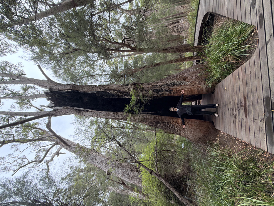 The image displays a dense forest environment in Tingledale, Australia, under an overcast sky. A single individual stands centrally on a damp, wooden boardwalk, directly in front of a massive tree with a prominent vertical hollow extending upwards through its trunk. The interior of the hollow is dark. The person, dressed in a dark long-sleeved top, dark pants, a dark cap, and light sneakers, poses with both arms extended horizontally outwards, palms facing upwards, and looks towards the camera. A dark shoulder bag hangs across their chest. The wooden boardwalk, showing signs of dampness, extends forward and splits into two distinct paths to the right of the central tree. Surrounding the boardwalk and the focal tree are numerous other tall trees with reddish-brown bark and green foliage, along with dense green undergrowth. The sky is a uniform light gray.