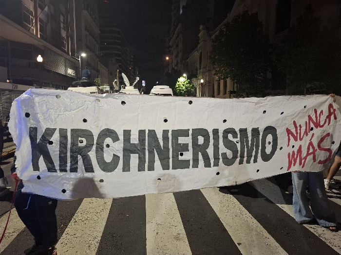 This nighttime image captures a street protest in Buenos Aires, Argentina. A large white plastic banner, bearing the black spray-painted text "KIRCHNERISMO" and the smaller, red spray-painted text "NUNCA MÁS" (Never Again), is held horizontally across a pedestrian crosswalk by two partially visible individuals. Small, circular holes are scattered across the banner's surface. The person on the left wears dark clothing, while the person on the right wears blue jeans. The street features distinct white crosswalk stripes. In the background, buildings line the street under a dark sky, illuminated by streetlights. A building on the left shows the visible street number "720" on its facade. A white vehicle, possibly a van, equipped with several roof-mounted antennae or satellite dishes, is present behind the banner. Another building with trees is visible further right. The scene is located on Avenida de Mayo at approximately number 720, in Buenos Aires.