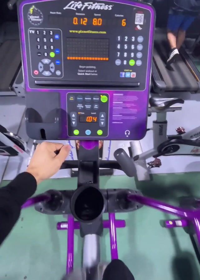 first-person perspective of someone exercising on a Life Fitness elliptical machine. The machine is purple and black, and the screen displays workout metrics, including time, resistance level, and heart rate. The person is wearing a black jacket and is holding onto the handles of the machine. Another person is visible in the background, using a treadmill. The environment is a gym setting with other workout equipment visible.