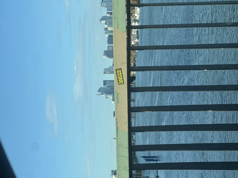 The image displays a daytime view across a body of water, likely the Seine River, from a bridge in Clichy, France, looking towards the La Défense business district. In the foreground, a metal bridge railing is visible. It features dark, vertically oriented bars, approximately six of which are clearly discernible. The top horizontal bar of the railing is divided into two distinct colored sections: a light olive green on the left half and a sandy beige on the right half. A rectangular yellow sticker with black, possibly East Asian or stylized script, is affixed to the sandy beige section of the top rail, slightly to the right of center. The midground is dominated by the wide, dark blue expanse of the water, exhibiting minor surface ripples, suggesting calm conditions. On the far left of the water, two blue vertical poles or markers are partially submerged. On the far right bank, a cluster of white recreational or residential boats are moored. Another bridge structure is faintly visible in the far distance across the water. The background presents a cityscape under a clear, bright blue sky with a few sparse, wispy white clouds. This skyline consists of numerous modern, high-rise skyscrapers with predominantly reflective glass facades, characteristic of the La Défense business district, situated to the southeast of Clichy. No individuals are visible in the scene. The overall lighting indicates clear daylight conditions.