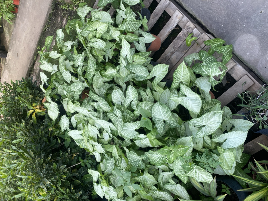 The image depicts a dense display of various potted plants in what appears to be a plant nursery or garden center in Santa Rosa, Argentina. The foreground and midground are dominated by numerous *Syngonium podophyllum* (arrowhead plants), characterized by their distinctive variegated light green and white leaves. These plants are closely arranged in individual pots, many of which are brown plastic, resting on weathered wooden pallets that are visible underneath and to the right. In the background, a thick mass of darker green foliage, including plants with yellow-speckled leaves, forms a dense wall of vegetation. To the lower right, a concrete or paved surface with visible dirt and small weeds extends, bordering the plant display. No individuals, specific actions, or direct interactions are observable within the frame.