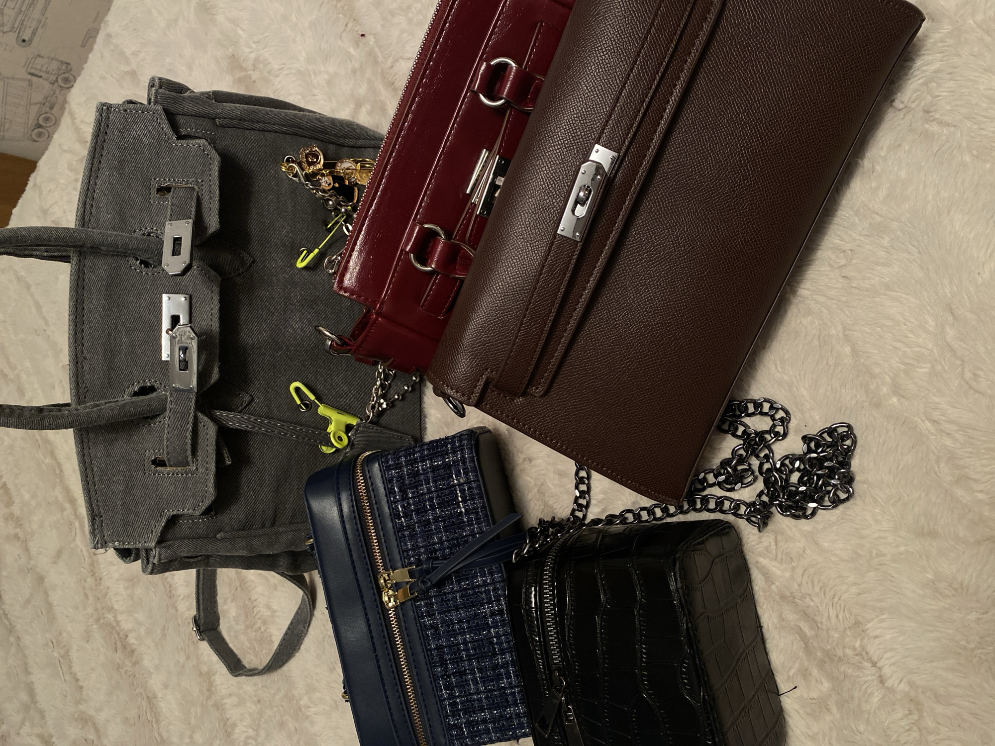 collection of four handbags on a textured, light-colored surface. A gray canvas tote bag with silver hardware lies on the left. Next to it is a burgundy-colored rectangular bag with silver hardware and a chain strap. A brown rectangular bag with silver hardware is positioned on top of the burgundy bag. Finally, a blue tweed rectangular bag and a black rectangular bag with a crocodile texture and a chain strap are in the bottom center. The scene suggests an indoor setting in Björklinge, Sweden. No people are visible. The focus is on the handbags and their arrangement.