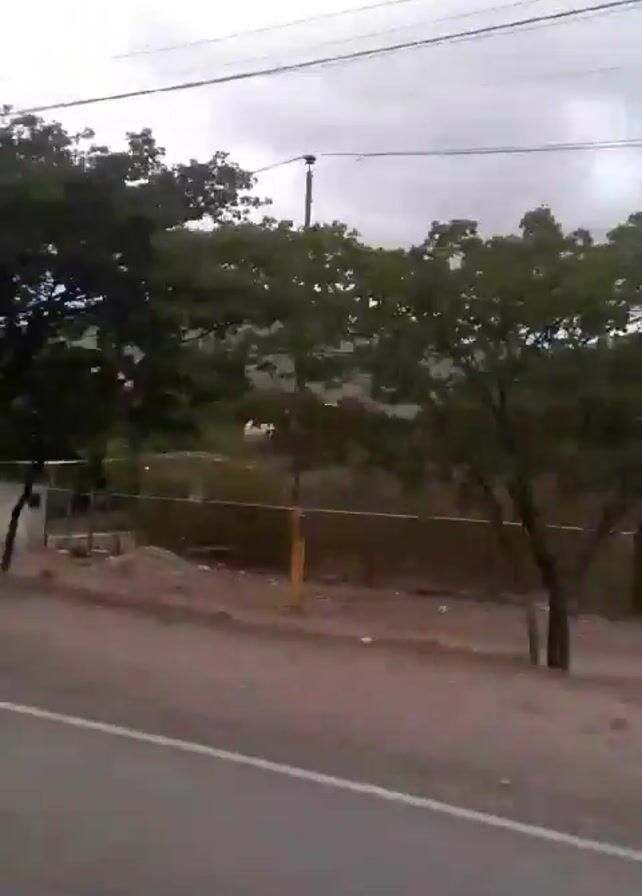 view from a moving vehicle traveling down a paved road. The road is bordered by dirt or gravel shoulders and vegetation. There are telephone poles along the side of the road, some painted with yellow and red stripes. Buildings can be seen in the background. The sky is overcast with some patches of blue visible. In the distance, a mountain is visible.