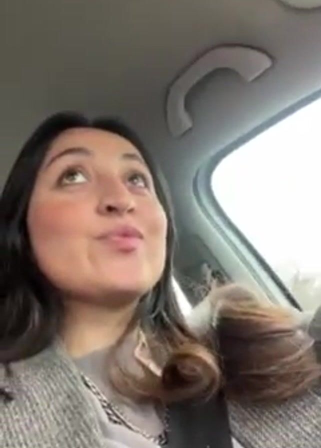 woman with long brown hair wearing a grey blazer and a silver chain necklace, inside of a car. She looks directly into the camera, making faces and puckering her lips. The interior of the car is visible, including the white roof and the window, through which an overcast sky is visible.
