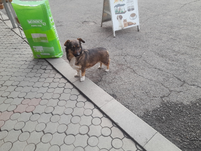 This image depicts an outdoor urban scene in Yerevan, Armenia. A medium-sized, short-legged dog with brown and tan fur and white markings on its chest and paws stands on a gray concrete curb, its head turned slightly to the right of the viewer. To the dog's immediate left, a large, bright green bag labeled "WINNY PUPPY FOOD" rests upright on a light gray concrete sidewalk patterned with interconnected circles. Further to the right and slightly behind the dog, a white A-frame sign, displaying various pet images including a dog, cat, and fish in an aquarium, stands on a dark gray asphalt surface that exhibits visible cracks. The curb separates the patterned sidewalk from the worn asphalt street or parking area. The scene is illuminated by daylight.