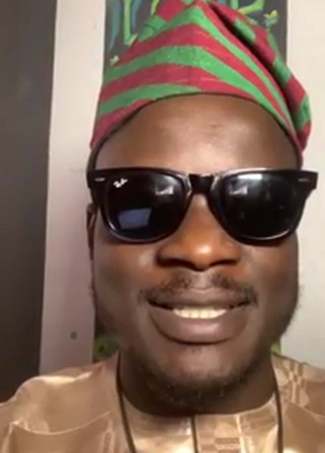 A man with dark skin and a neatly trimmed beard is looking directly at the camera. He is wearing a striped red and green hat, black Ray-Ban sunglasses, and a patterned gold-colored shirt. He briefly sticks his tongue out. Behind him is a white wall with a piece of artwork displaying the word "LOVE" in different colors and designs.
