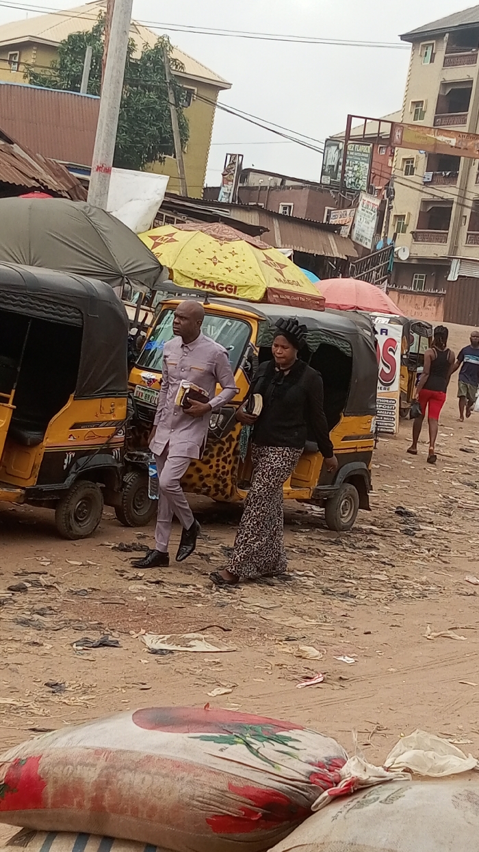 An overhead view captures an unpaved, dirt street scene in Onitsha, Nigeria, under an overcast sky. The ground is uneven, littered with various debris including plastic bags and paper. In the immediate foreground, several large sacks lie horizontally, one prominently displaying a red and green floral pattern. In the midground, two pedestrians walk in opposite directions. On the left, a light-skinned man with a bald head walks from left to right, wearing a light purple tunic with metallic embellishments, matching trousers, and black dress shoes. He carries a dark-colored book in his left hand and a clear plastic water bottle in his right. He looks forward and slightly to the right. Parallel to him, a dark-skinned woman walks from right to left, wearing a black long-sleeved top, a patterned skirt, and a black headwrap. She carries a dark-colored book in her left hand and looks downward. Behind these individuals, multiple yellow motorized tricycles ("Keke Napep") are visible. One directly behind the man features a distinct leopard-print pattern on its side. Several market stalls are present, characterized by large umbrellas; a prominent yellow umbrella bears the "MAGGI" logo. Another dark green umbrella is on the far left, and a red one is further back. Two additional male figures walk away from the camera in the background on the right. One wears a dark top and red shorts, the other a striped shirt. The background consists of multi-story buildings, some with balconies and corrugated metal roofs. Numerous advertising signs are mounted on buildings and poles, including "MAGGI" on an umbrella and other text-heavy signs. Overhead utility poles and electrical wires crisscross the frame.