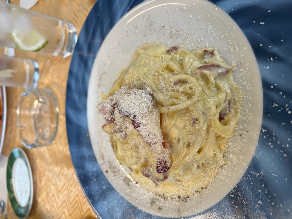 - "A close-up, elevated shot displays a serving of spaghetti carbonara on a round white plate with a wavy blue rim" by FM-iAXv12, licensed under CC BY 4.0