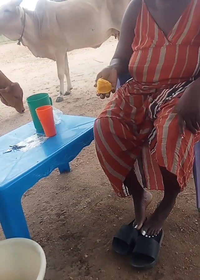 A woman in a striped dress sits next to a blue plastic table. She holds a mango and uses a knife to peel it. The table has an orange and a green plastic cone on it, as well as a small white object. Beside the table is a white bucket containing a liquid. A tan cow and calf stand near the table. The ground is dirt.