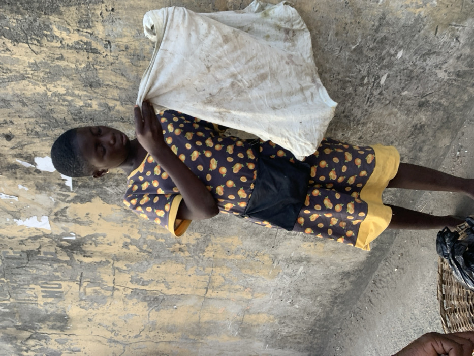A young individual, identified as female, stands outdoors in Lekki, Nigeria, facing slightly left of the camera. She wears a dark-colored dress patterned with light orange or yellow fruit shapes and trimmed with yellow at the short sleeves and hem. A black fanny pack or small utility bag is secured around her waist. She holds an off-white, soiled fabric bag open with both hands, looking down into it. Her short, dark hair is closely cropped. To her immediate left, at the bottom of the frame, a segment of a woven basket containing a crumpled black plastic bag is visible. The background consists of a weathered concrete or stucco wall, primarily discolored yellowish-beige with extensive peeling paint, cracks, and greyish patches. Faint, obscured text or remnants of posters are visible on the wall surface. The ground beneath appears rough and unpaved.