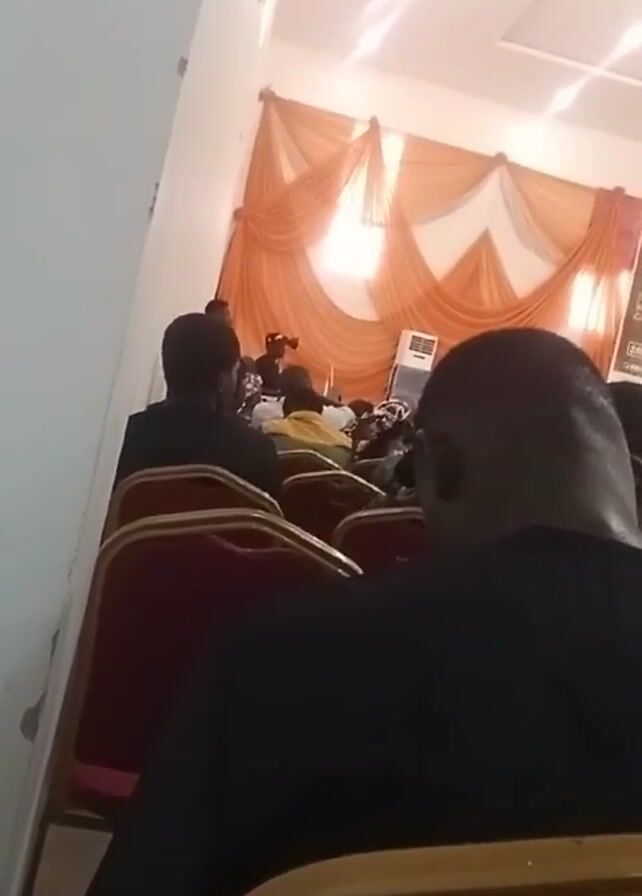The video depicts a view from the back of a room with rows of red chairs, occupied by several people attending a presentation or conference