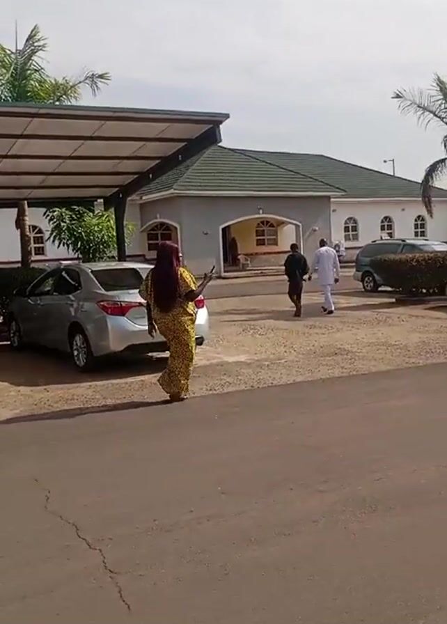 A woman in a yellow and black patterned dress and a headscarf walks toward the camera. She raises her arms slightly and speaks. Behind her is a gray sedan parked under a carport-like structure. Behind that is a house with a gray roof and white trim. Two men in casual clothing walk away from the house. There is another car parked to the right of the house. There are palm trees in the distance.