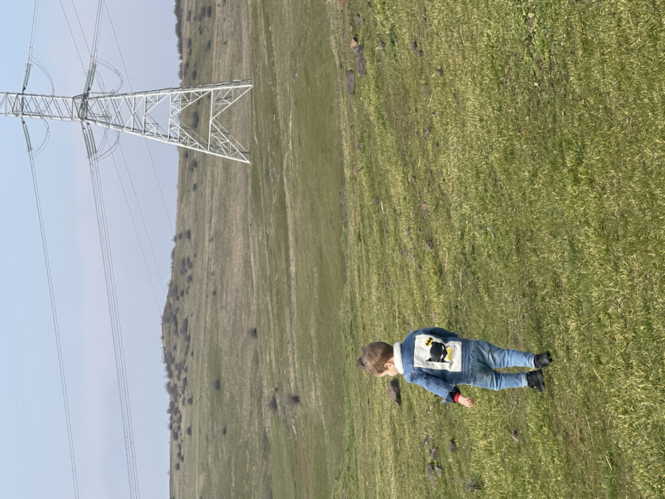 A young child, viewed from behind, walks leftward across a gently sloping, green grassy field interspersed with brown patches and dark rocks. The child wears a light blue denim jacket with a white fleece collar and a rectangular white patch on the back featuring a black Batman logo with a yellow bow tie. Light blue jeans and black shoes complete the attire. In the midground to background, a large, silver-colored, lattice-work electrical transmission tower stands prominently on the right. Multiple power lines extend horizontally across the frame, connecting to the tower and traversing rolling hills covered in sparse, dry vegetation and shrubs in the distance. The sky above is clear and light blue. The scene is located in an unspecified rural or semi-rural area near the city of Unknown, Unknown.
