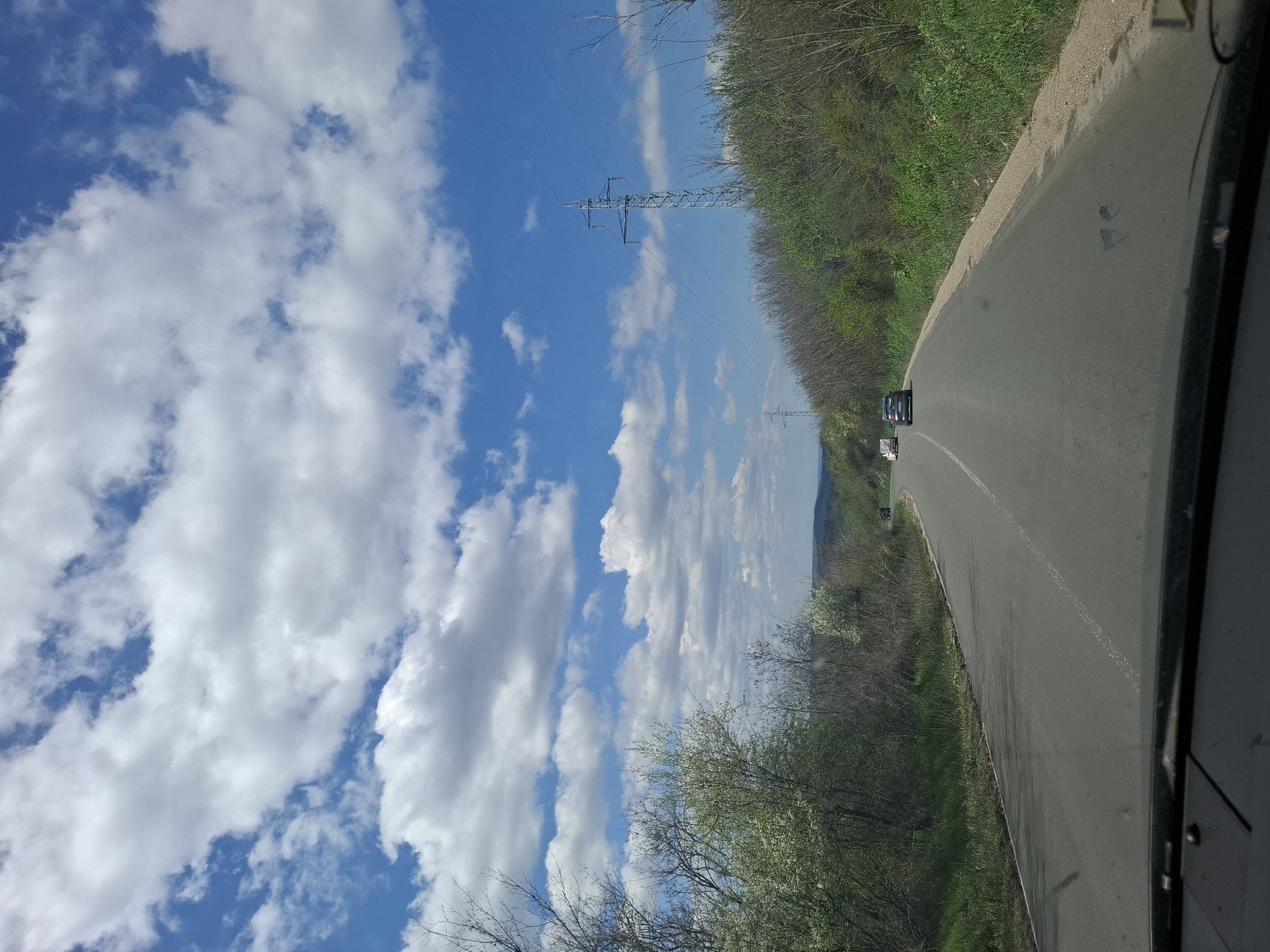 road near Topolovets, Bulgaria. The view is likely from a car. The road is asphalt and curves slightly. Greenery and trees line the side of the road. A few cars are visible on the road. High-voltage power lines cross the sky. The sky is blue with fluffy white clouds.