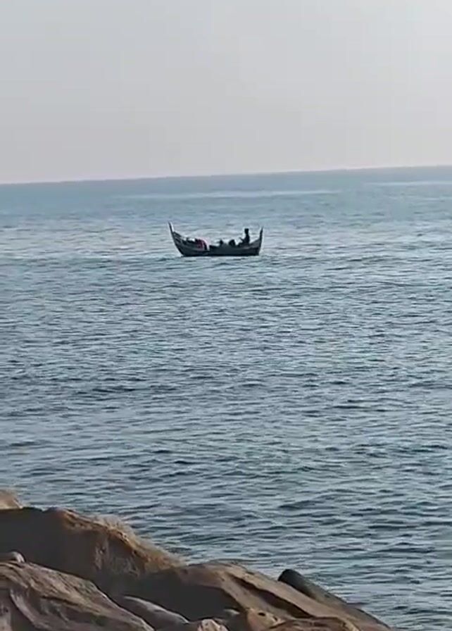 small, dark-colored boat on a calm body of water. There are several people in the boat, one of whom is standing. In the foreground, there is a rocky shoreline. The sky is overcast.