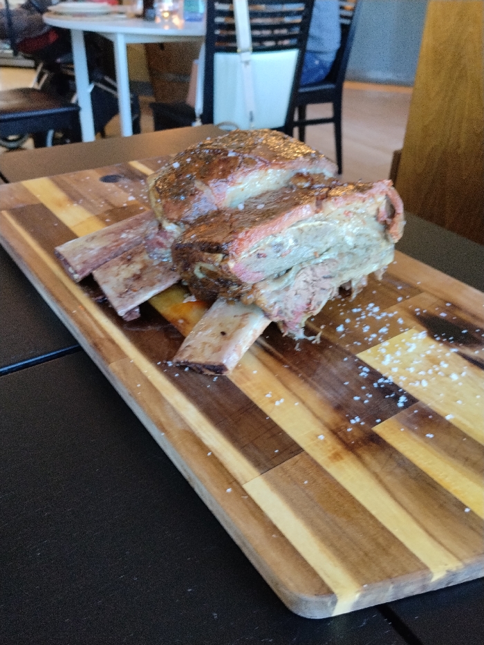 - "A large portion of roasted beef ribs is presented on a rectangular wooden cutting board, positioned on a dark, textured table surface within a restaurant in Viana do Castelo, Portugal" by FM-xkd7v1, licensed under CC BY 4.0