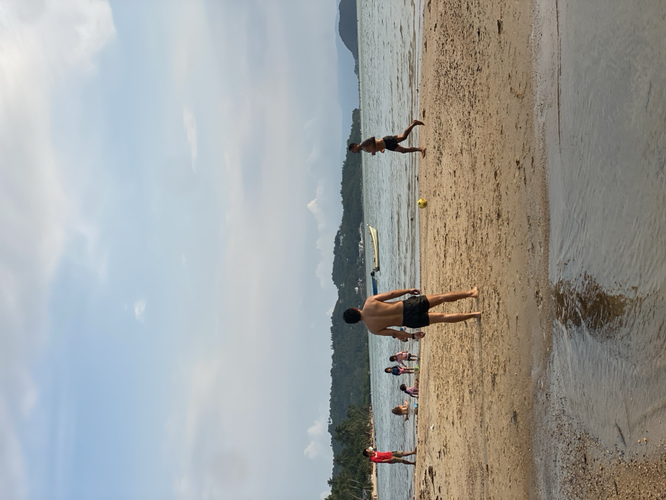 The image captures a daytime scene on a sandy beach in Baan Sri Thanu, Thailand, under a partly cloudy sky