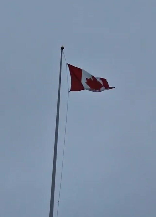Canadian flag waving atop a tall flagpole against a neutral gray sky