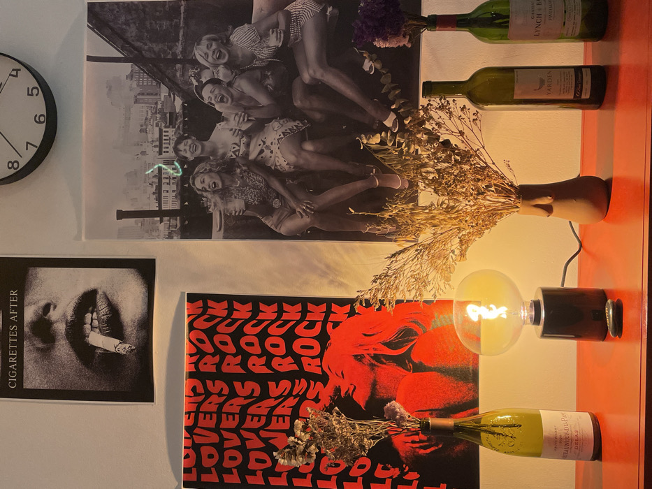 The scene depicts an interior wall and a surface in Herzliya, Israel. The wall is decorated with three framed prints and a clock. The top-left print is a black-and-white close-up of a person's mouth with painted lips holding a lit cigarette, titled "CIGARETTES AFTER". The top-right print is a black-and-white image of five women, commonly identified as characters from "Sex and the City," laughing together on a rooftop or balcony with a cityscape in the background; a faint green light trail is visible above the cityscape. A circular black-framed clock showing approximately 10:45 is partially visible above this print. The bottom-left print is a red and black poster with the repeating, wavy text "LOVERS ROCK" above a red silhouette of a person's head and upper torso looking upwards. Below the wall art, a smooth, reddish-brown or dark orange surface holds several decorative items. From left to right: an empty green wine bottle labeled "CHATEAU NEUF-DU-PAPE DELAS" containing dried, light-colored foliage; a modern table lamp with a black cylindrical base and a large, spherical clear glass bulb with an exposed filament, emitting warm light; a small black remote control lies in front of the lamp; a brown ceramic vase with an abstract form holding a bouquet of dried, light-colored foliage; an empty green wine bottle labeled "YARDEN"; and another empty green wine bottle labeled "CHATEAU LYNCH BAGES PAUILLAC" containing dried purple flowers. The lighting is warm and artificial, suggesting an indoor setting.