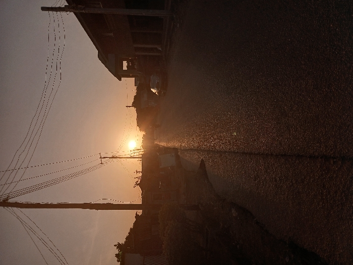 An evening sun casts long shadows on a rural street. Utility poles and wires line the left side, adjacent to aged structures. Cars are parked near buildings, adding to the scene's depth. The paved road shows signs of wear, bathed in sunlight. Vegetation flanks the street, complementing the rustic setting. A sense of quietude pervades the scene, intensified by the diminishing light.
