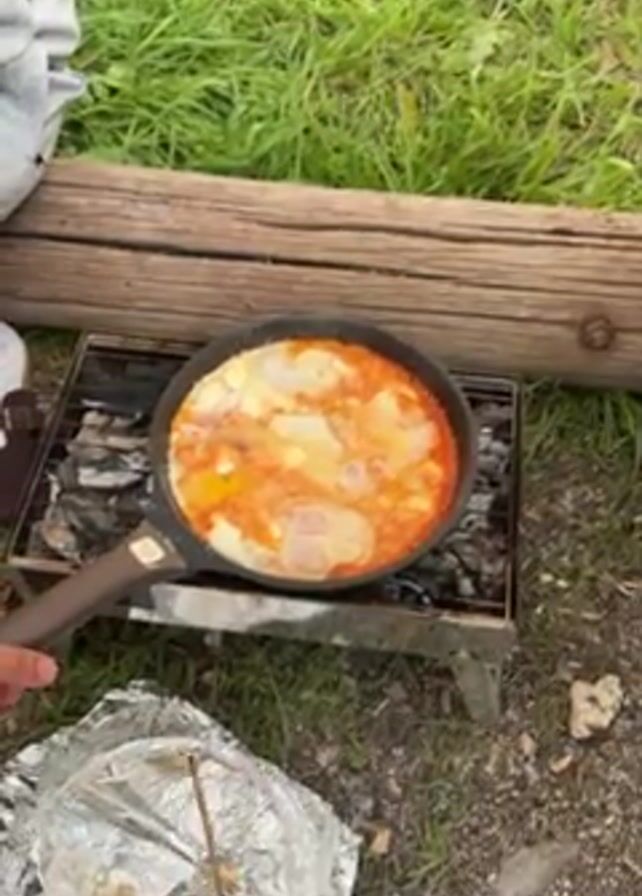 frying pan being used to cook eggs in tomato sauce over charcoal embers outdoors