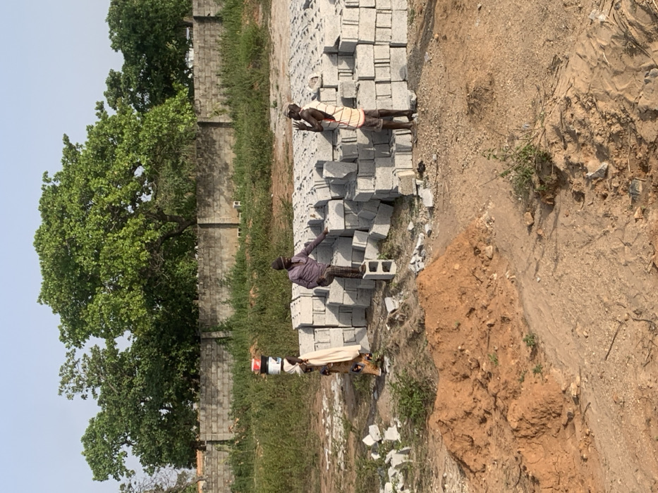 This image, taken in Karsana 2, Nigeria, depicts an outdoor scene dominated by construction materials and three individuals