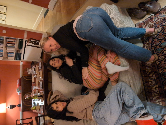 Three young women are lounging on a couch. One blonde woman wears jeans and a black shirt, leaning forward with a smile. Another, in a black shirt and striped pants, is positioned beneath her. The third woman, in a tan sweater and light wash jeans, is at the bottom, sticking her tongue out. An ornate wooden table with glasses and bottles is beside the couch, and a rug is seen on the floor.