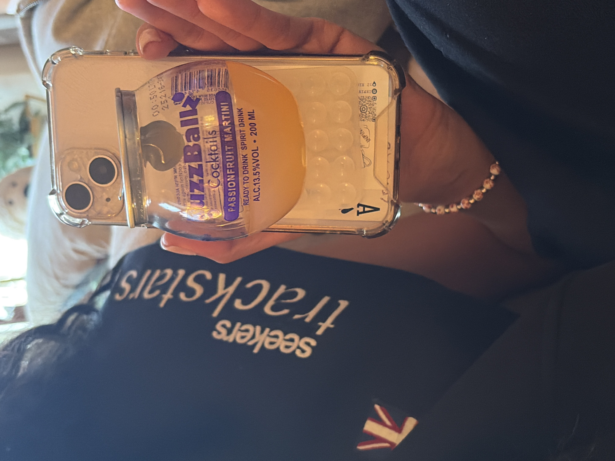 A person holds a smartphone in a clear case with a sticker of a "BuzzBallz" passionfruit martini on the back