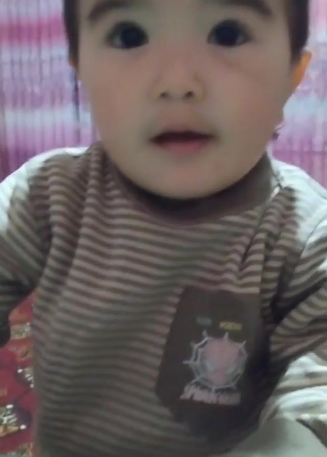 A close-up shot shows a young child looking directly at the camera. The child has dark hair and eyes, light skin, and slightly pronounced eyebrows. They are wearing a striped, long-sleeved shirt with a pocket that has an image of Spiderman on it. The child looks down and away from the camera at times. In the background, there is a red rug with gold patterns, a section of a light green object, and a curtain with a light pink pattern. The sound is indistinct speech.