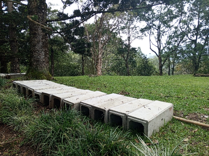 A row of concrete, square-shaped drainage pipes sits on a grassy lawn in a wooded area