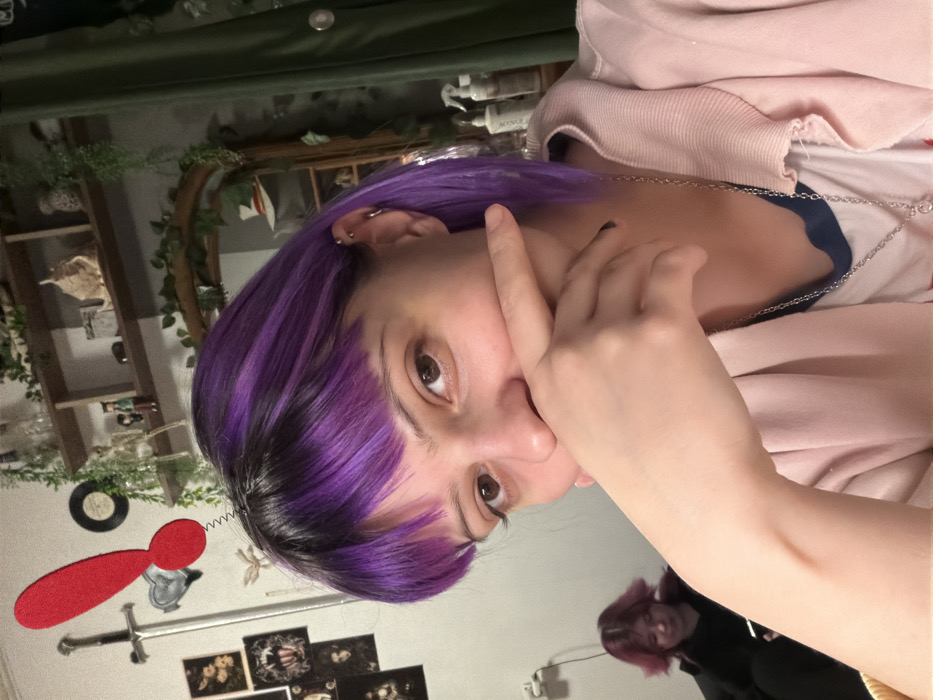 - "A woman with purple and black hair covers part of her face with her hand" by FM-3WDDJ2, licensed under CC BY 4.0