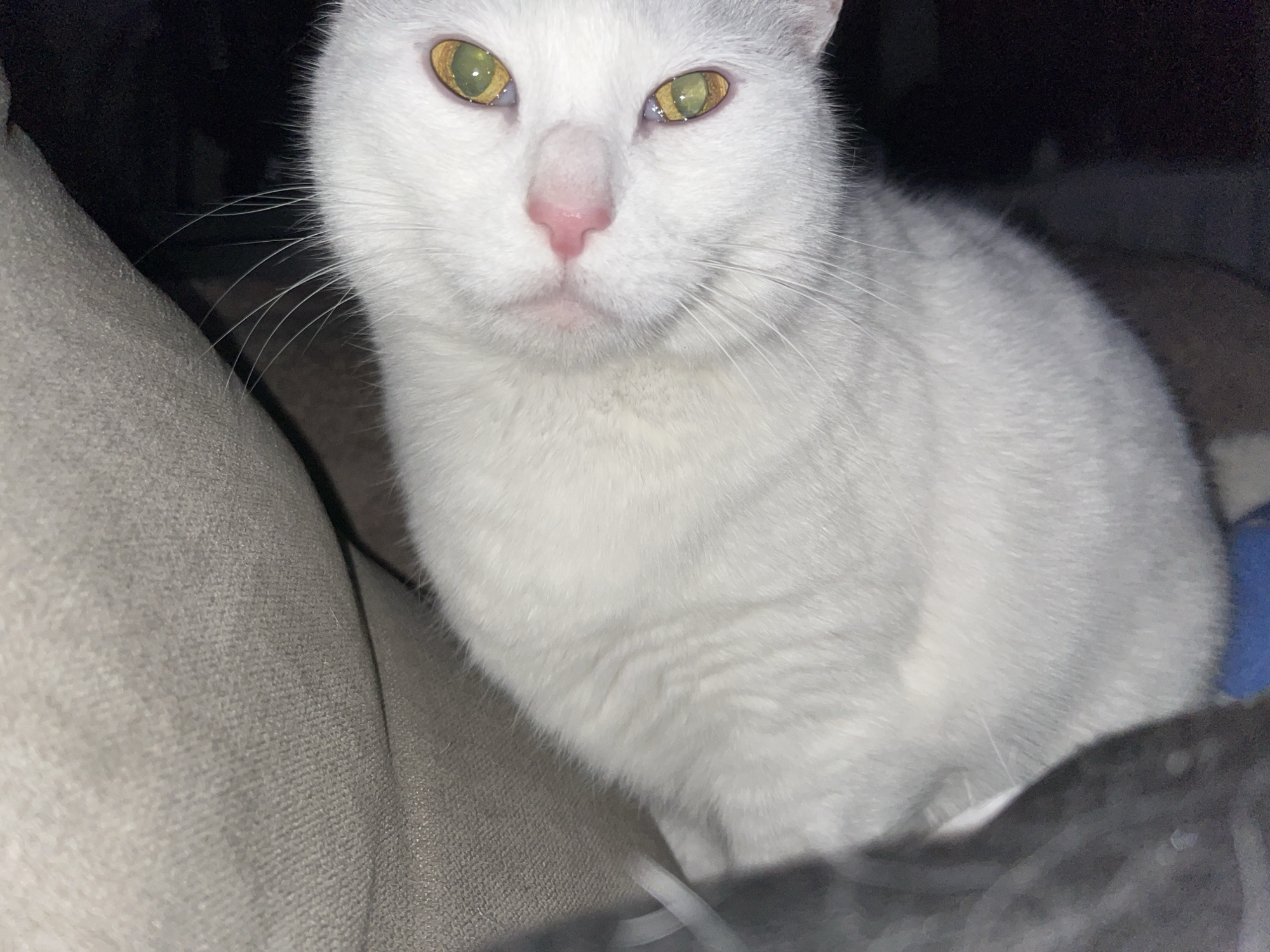The scene is located indoors in Dimchevo, Bulgaria. A white domestic short-haired cat is positioned in the upper center of the frame, its head tilted slightly, looking directly towards the viewer. The cat possesses pure white fur, a small pink nose, and prominent green eyes with a yellow tint, displaying vertical pupils. Long white whiskers extend from its muzzle. The cat's body is partially visible, mostly covered by the background elements. To the upper left and behind the cat is a textured, light beige fabric surface, likely upholstery. The lower right portion of the image is dominated by a dark, indistinct area. A dark grey fabric object is partially visible on the lower left, and a small segment of blue fabric appears at the very bottom edge of the frame. Lighting on the cat's face is direct, illuminating its features against the partially shadowed background.