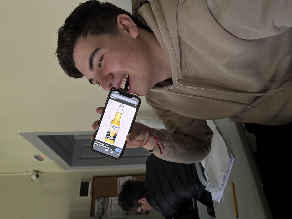 The scene depicts an indoor environment, presumed to be in Plovdiv, Bulgaria, characterized by light yellow walls and a grey doorframe in the background. A young male, approximately late teens to early twenties, with dark hair and wearing a light brown hooded sweatshirt, occupies the foreground. He holds a black smartphone horizontally with his left hand, positioning the top edge of the device, where the notch is located, near his open mouth as if simulating drinking. The phone screen displays an image of a Corona Extra beer bottle against a transparent, checkered background. The subject exhibits an expression of amusement with a wide smile. A red and white braided string bracelet is visible on his left wrist. In the mid-ground, to the left, another individual is partially visible from behind, seated at a light-colored desk. This person wears a dark jacket and appears to be looking downwards. On the desk in front of them, stacks of white papers and a yellow pencil are present. On the wall behind the seated individual, a brown cork board with some attached documents and a small electronic device are visible. In the upper left corner of the room, a dome-style security camera and a small red indicator light are mounted on the wall near the grey-painted doorframe. The setting appears to be a classroom or a similar institutional room.