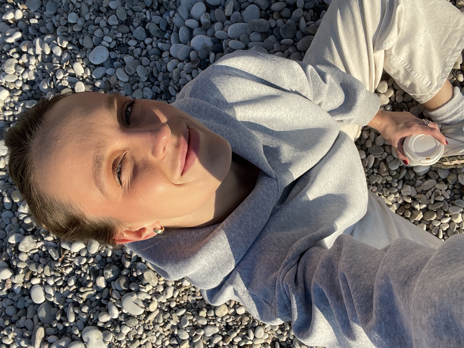 A high-angle forensic shot captures a Caucasian female seated on a pebble beach in Drobnići, Montenegro. The subject, positioned with her head slightly tilted, looks directly at the camera with a subtle smile. Her light-colored hair is pulled back, revealing small gold hoop earrings. She wears a light gray hooded sweatshirt and light-colored pants, with a white sneaker and sock partially visible on her right foot. Her left hand, adorned with red nail polish and a ring, holds a white disposable coffee cup with a lid, resting near her right leg. The ground beneath her consists of numerous smooth, rounded pebbles of various light shades. The scene is illuminated by strong natural sunlight, casting distinct shadows on the pebbles and highlighting the subject's face.