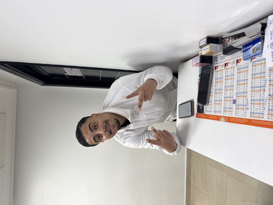 A male individual is depicted in an office or service counter setting in Meknes, Morocco