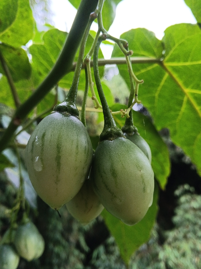 - "A close-up reveals vibrant green foliage and several unripe tamarillo fruits hanging from stems" by FM-D2rLt1, licensed under CC BY 4.0