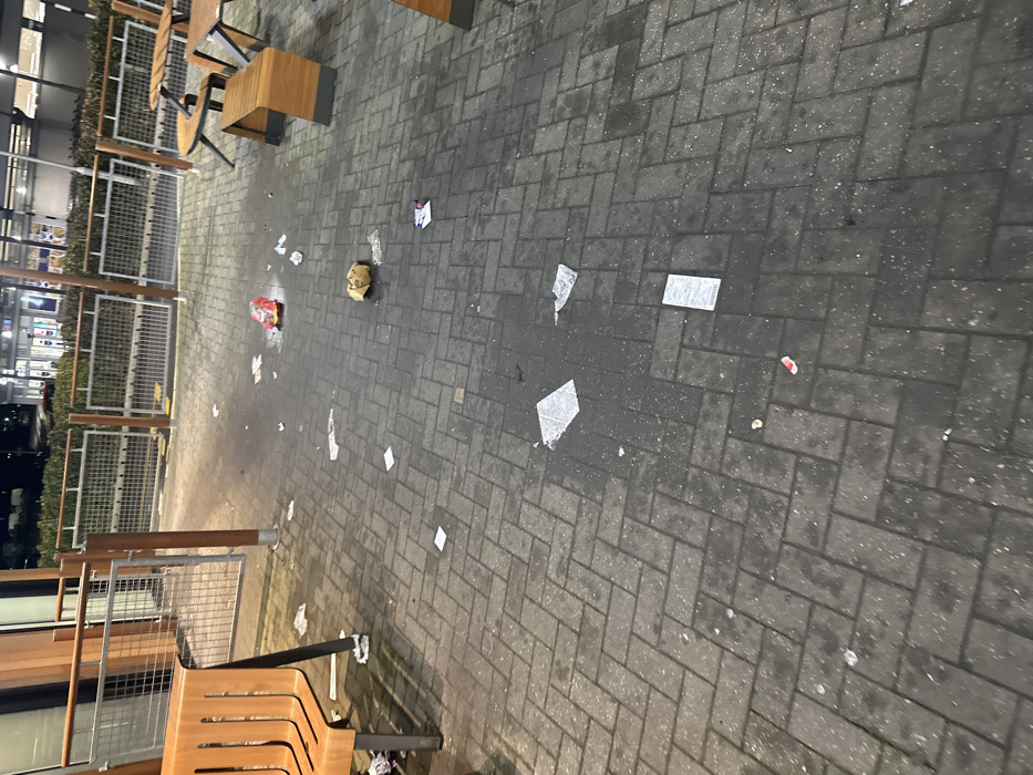 This image displays an illuminated outdoor paved seating area at night, located at the McDonald's restaurant within Halbeath Retail Park, Dunfermline, United Kingdom. The ground consists of grey herringbone pattern block paving, which is extensively covered with discarded fast-food packaging and general litter. Visible debris includes multiple white paper napkins or wrappers, crumpled brown paper bags, a red and gold colored packet, several paper receipts, and various small plastic items. On the left side of the frame, a segment of a long, slatted wooden bench with a dark metal support frame is visible. Towards the right, at least two outdoor dining tables are present, each featuring a slatted wooden tabletop and integrated benches, all supported by dark, angular metal frames. A low metal mesh fence, interspersed with wooden posts, separates the immediate seating area from a larger paved expanse beyond. In the background, the brightly lit exterior of the McDonald's restaurant building is visible, with additional artificial lighting suggesting an adjacent parking lot or drive-thru area further in the distance. No individuals are present within the scene.