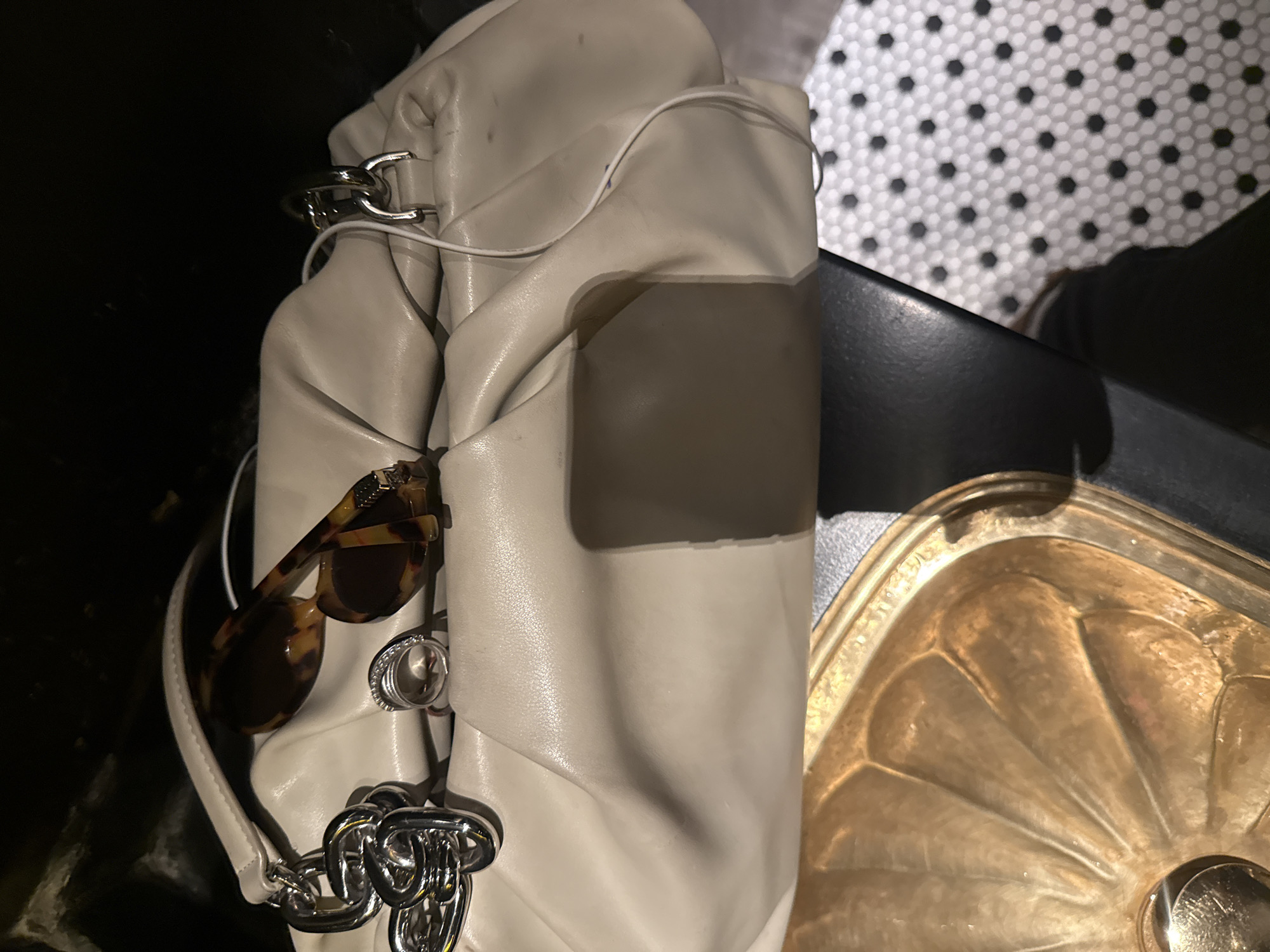 A high-angle shot captures a cream-colored, seemingly soft, leather handbag. Sunglasses with a brown tortoiseshell pattern are clipped to the bag's side, partially obscuring a silver ring. A chunky silver chain dangles from the bag's handle. To the right of the bag, a section of a gold, scallop-edged bowl is visible. The bag rests on a black surface next to the bowl. In the background, a black and white patterned floor can be seen. The location is not determinable from the visual information provided.