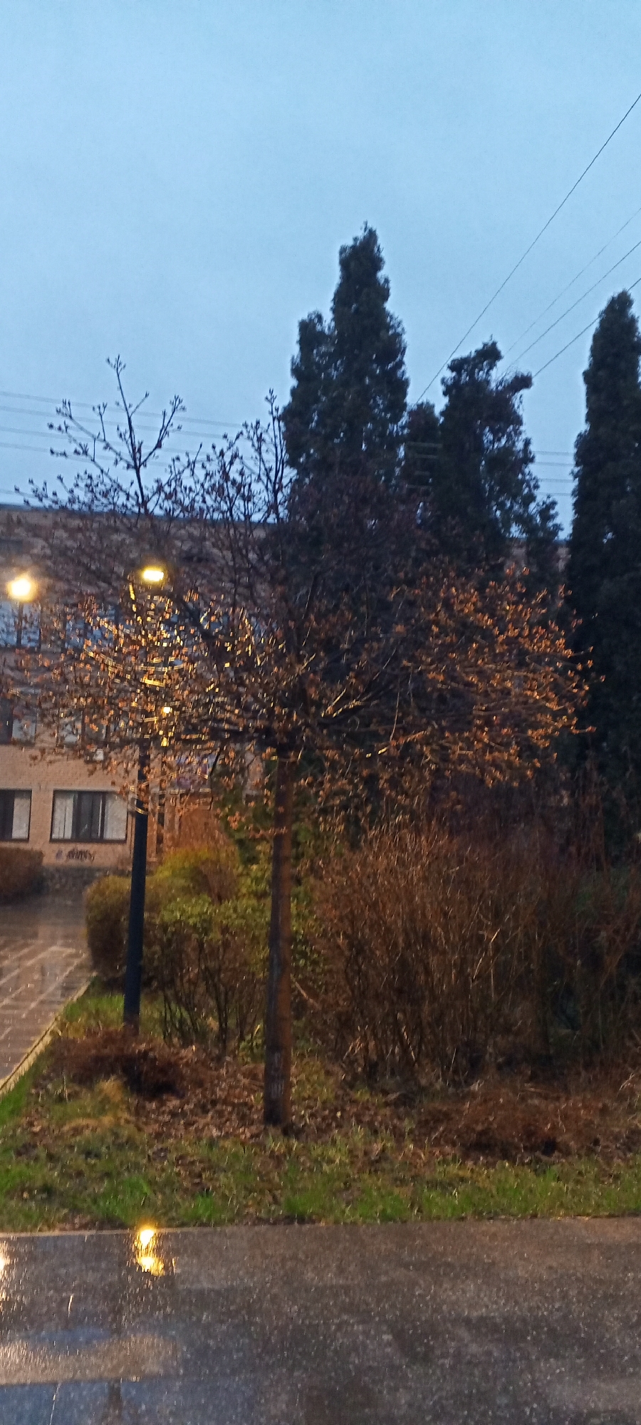 A street scene in Dmitrov, Russia, shows a rain-slicked asphalt surface in the foreground. Midground features include a tree with sparse, budding branches, a building with rectangular windows, street lights, and several evergreen trees. Overhead power lines are visible. The sky is overcast.