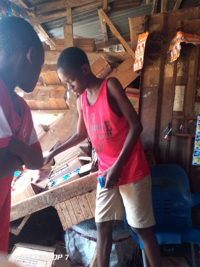 The image depicts an interior scene, likely a small, informal retail stall or storage area, within the city of Unknown, Unknown. Two dark-skinned male individuals are present. The individual on the left, partially visible from the back and left side, wears a red shirt with white detailing on the shoulder. His arms are not clearly visible, but he appears to be facing and observing the second individual. The second individual, positioned slightly to the right of the frame's center, is wearing a red sleeveless tank top with dark lettering, including "MONROE" visible, and light brown or khaki shorts. He stands leaning forward over a makeshift wooden counter or display table constructed from planks and supported by various cardboard boxes. His left hand extends towards the surface, near several blue-packaged items visible within an open cardboard box. In his right hand, he holds a single blue and white packaged item. His gaze is directed downwards at the items on the counter. The immediate environment is characterized by makeshift construction. Above the wooden counter, numerous cardboard boxes are stacked, some open to reveal contents. The background features rough wooden structural elements, including beams and planks, and corrugated metal sheeting suggesting a basic roof or ceiling structure. On the far right wall, several rows of small, orange-packaged products, labeled "TOCO" and "Super Shine," hang from a display rack. Below the counter on the right, a portion of a blue plastic chair is visible, along with a large, grey or white textured sack on the floor. The overall impression is one of a functional, but rudimentary, commercial space.