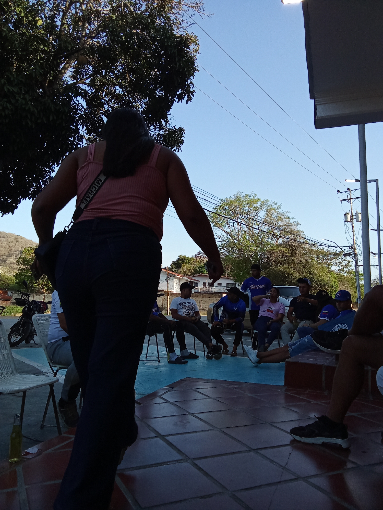 The image depicts a group of people gathered outdoors, possibly in La Asuncion, Venezuela. The scene includes a woman walking away from the viewer toward a group of seated individuals. The seated people are dressed casually, some wearing sports-related attire. They are sitting on chairs arranged in a semi-circle. A motorcycle is visible in the background. Utility poles with wires are also present in the scene, along with trees and houses. The foreground features tiled flooring. A bottle is on the ground near some chairs.